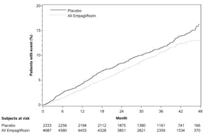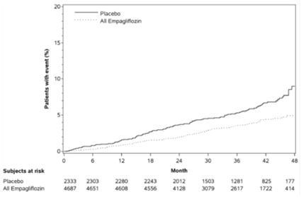 또한 현성알부민뇨가 있는 환자에서 지속적인 정상알부민뇨 또는 미세알부민뇨로의 전환은 위약대비 엠파글리플로진에서 더 높게 나타났다. (엠파글리플로진 49.7%, 위약 28.8%, 위험비(HR) 1.82, 95 % CI 1.40, 2.37).