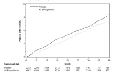 ⓡ 임상연구에 심혈관계 고위험군 환자 7,020명이 이 약 10 mg/일(n=2,345명), 이 약 25 mg/일(n=2,342) 또는 위약 (n=2,333)을 최대 4.5년동안 투여받았다. 이 연구에서 엠파글리플로진의 전반적인 안전성 프로파일은 이미 알려진 안전성 프로파일과 유사하였다.