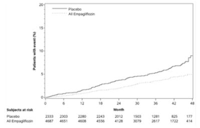 EMPA ‑REG OUTCOME 시험에서 엠파글리플로진은 위약과 비교하였을 때 심부전으로 인한 입원의 위험을 감소시켰다 (엠파글리플로진 2.7 %; 위약 4.1 %; 위험비(HR) 0.65, 95 % CI 0.50, 0.85).