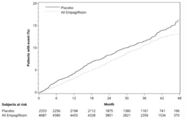 또한 현성알부민뇨가 있는 환자에서 지속적인 정상알부민뇨 또는 미세알부민뇨로의 전환은 위약대비 엠파글리플로진에서 더 높게 나타났다. (엠파글리플로진 49.7%, 위약 28.8%, 위험비(HR) 1.82, 95 % CI 1.40, 2.37).