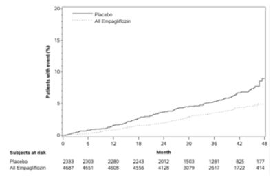 ⓡ 임상연구에 심혈관계 고위험군 환자 7,020명이 이 약 10 mg/일(n=2,345명), 이 약 25 mg/일(n=2,342) 또는 위약 (n=2,333)을 최대 4.5년동안 투여받았다. 이 연구에서 엠파글리플로진의 전반적인 안전성 프로파일은 이미 알려진 안전성 프로파일과 유사하였다.