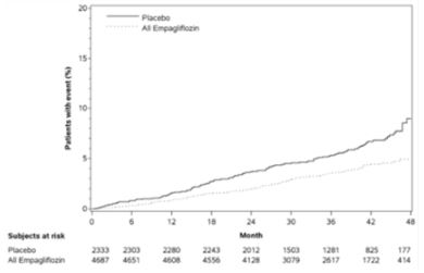 또한 현성알부민뇨가 있는 환자에서 지속적인 정상알부민뇨 또는 미세알부민뇨로의 전환은 위약대비 엠파글리플로진에서 더 높게 나타났다. (엠파글리플로진 49.7%, 위약 28.8%, 위험비(HR) 1.82, 95 % CI 1.40, 2.37).