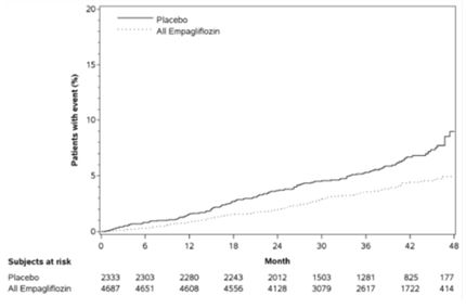 EMPA ‑REG OUTCOME 시험에서 엠파글리플로진은 위약과 비교하였을 때 심부전으로 인한 입원의 위험을 감소시켰다 (엠파글리플로진 2.7 %; 위약 4.1 %; 위험비(HR) 0.65, 95 % CI 0.50, 0.85).