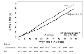 다파글리플로진 10mg은 일차 복합 평가변수인 심부전으로 인한 입원 또는 심혈관계 질환 사망의 예방에 대해 위약 대비 우월한 효과를 나타냈다 (그림 1).
