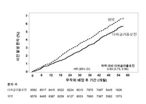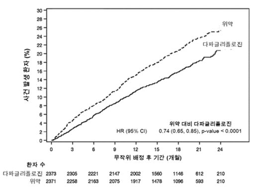 사건 발생 곡선은 다파글리플로진과 위약에 대해 초기부터 간격이 벌어져 시험 기간 전체동안 계속 지속되었다 (그림 2).