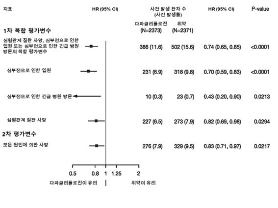 다파글리플로진 10mg은 일차 복합 평가변수인 심부전으로 인한 입원 또는 심혈관계 질환 사망의 예방에 대해 위약 대비 우월한 효과를 나타냈다 (그림 1).