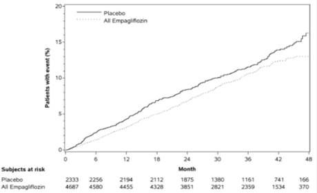 EMPA‑REG OUTCOME 시험에서 엠파글리플로진은 위약과 비교하였을 때 심부전으로 인한 입원의 위험을 감소시켰다 (엠파글리플로진 2.7 %; 위약 4.1 %; 위험비(HR) 0.65, 95 % CI 0.50, 0.85).