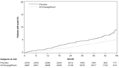 또한 현성알부민뇨가 있는 환자에서 지속적인 정상알부민뇨 또는 미세알부민뇨로의 전환은 위약대비 엠파글리플로진에서 더 높게 나타났다. (엠파글리플로진 49.7%, 위약 28.8%, 위험비(HR) 1.82, 95 % CI 1.40, 2.37).