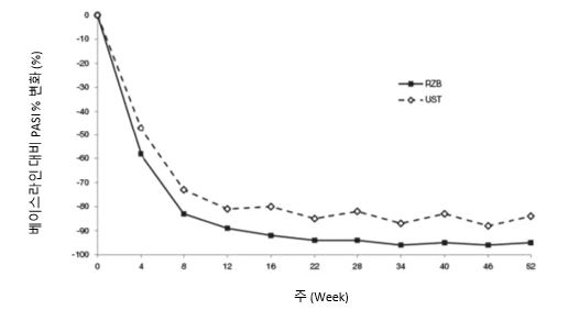 이 약 투여 결과 건선성 관절염 시험대상자에서 건선의 피부 증상이 통계적으로 유의하게 개선되었다.