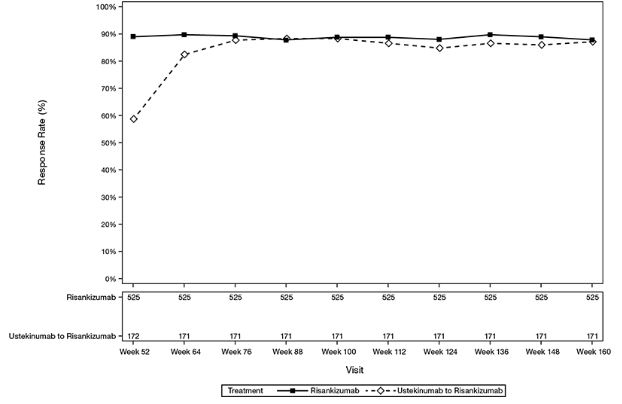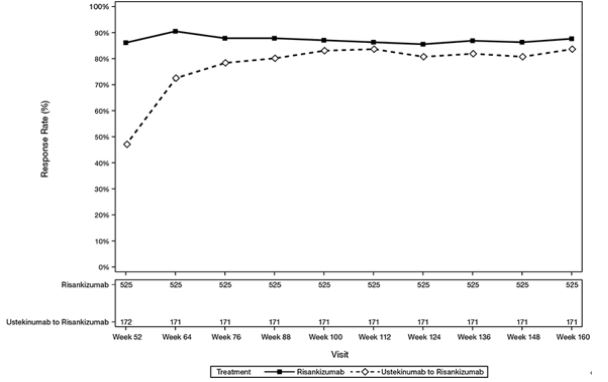 이 약을 투여받은 시험대상자들은 위약에 비해 16주차에 PPPASI 점수에서 통계적으로 유의한 개선을 보였다. 이러한 개선은 68주차까지 유지되었다. 이 약 투여군에서 PPPASI 50을 달성한 시험대상자의 비율은 16주차에 41.4%, 68주차에 85.5% 였으며, PPPASI 75를 달성한 시험대상자의 비율은 16주차에 12.1%, 68주차에 56.4% 였다.