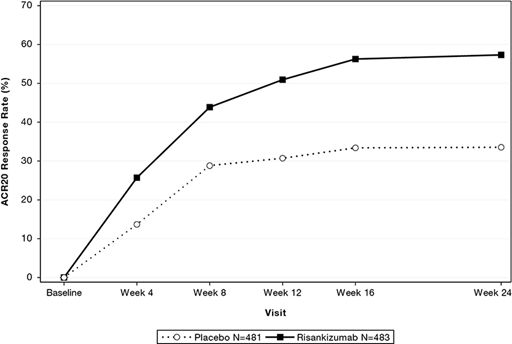KEEPSAKE 1에서 이 약 (‑0.31)을 투여한 시험대상자는 위약 (‑0.11)에 비해 24주차에 HAQ‑DI로 평가한 신체 기능에서 베이스라인 대비 통계적으로 유의한 개선을 보였다 (p‑값 ≦ 0.001). KEEPSAKE 2에서 이 약 (‑0.22)을 투여한 시험대상자는 위약 (‑0.05)에 비해 24주차에 HAQ‑DI에서 베이스라인 대비 통계적으로 유의한 개선을 보였다 (p‑값 ≦ 0.001). 두 시험의 이 약 투여군에서 위약에 비해 더 많은 비율의 시험대상자가 24주차에 HAQ‑DI 점수에서 베이스라인 대비 최소 0.35의 임상적으로 의미 있는 감소를 달성했다. 두 시험에서 신체 기능의 개선은 52주차까지 유지되었다.