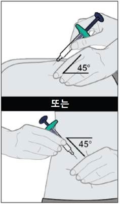 주사부위를 동봉된 알콜솜으로 닦는다. 주사바늘 덮개를 벗기고, 주사부위를 부드럽게 잡아 고정한 후 피부와 45도 각도로 주사한다.