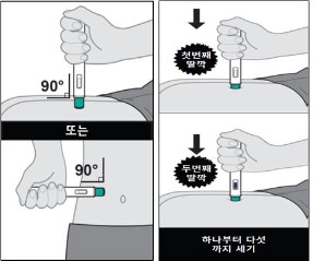 ➅ 두번째 ‘딸깍’ 소리를 듣고서, 완전한 주사를 위해 펜을 피부에 강하게 누른 채로 천천히 하나부터 다섯까지 센다.