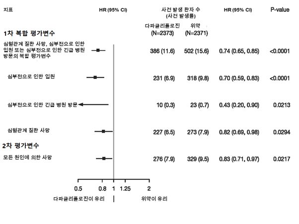 다파글리플로진은 일차 복합 평가변수인 심혈관계 질환 사망, 심부전으로 인한 입원 또는 심부전으로 인한 긴급 병원 방문의 발생률을 감소시켰다 (HR 0.74 [95% CI 0.65, 0.85], p < 0.0001).