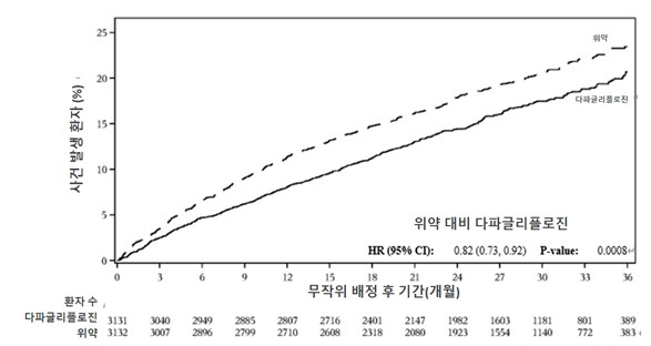 사건 발생 곡선은 다파글리플로진과 위약에 대해 초기부터 간격이 벌어져 시험 기간 전체동안 계속 지속되었다 (그림 2).