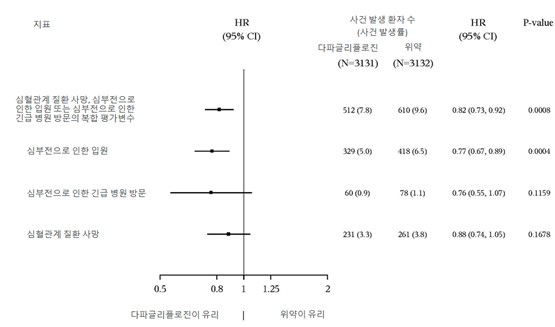 각 구성요소에 대한 p‑value는 명목상의 값이다. 일차 평가변수의 구성요소로 나타나있는 심혈관계 질환 사망은 정식 제 1종 오류 통제 아래 이차 평가변수로 시험되었다.