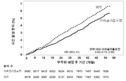다파글리플로진의 위약 대비 치료 유익성은 베이스라인에서의 심혈관계 질환의 유무 및 기저 심부전의 유무와 관계없이 관찰되었고, 연령, 성별, 신기능 (eGFR) 및 지역 등 핵심 하위군 전반에서 일관성을 보였다.