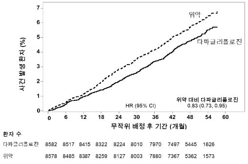 다파글리플로진 10mg은 심혈관계 질환 사망, 심근경색 또는 허혈성 뇌졸중으로 정의되는 심혈관계 관련 사건(MACE)의 복합 평가변수에 대한 위약 대비 비열등성을 입증하였다(단측 p<0.001).