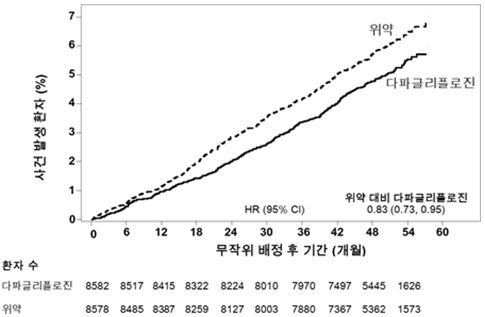 다파글리플로진 10 mg은 심혈관계 질환 사망, 심근경색 또는 허혈성 뇌졸중으로 정의되는 심혈관계 관련 사건(MACE)의 복합 평가변수에 대한 위약 대비 비열등성을 입증하였다(단측 p<0.001).