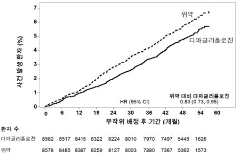 다파글리플로진 10 mg은 심혈관계 질환 사망, 심근경색 또는 허혈성 뇌졸중으로 정의되는 심혈관계 관련 사건(MACE)의 복합 평가변수에 대한 위약 대비 비열등성을 입증하였다(단측 p<0.001).