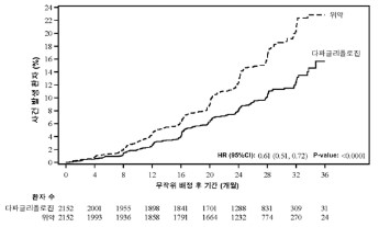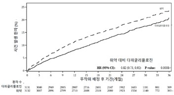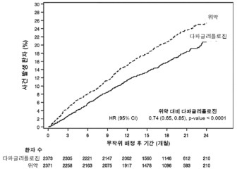 사건 발생 곡선은 다파글리플로진과 위약에 대해 초기부터 간격이 벌어져 시험 기간 전체동안 계속 지속되었다 (그림 2).