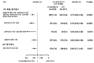 그림 7 일차 및 이차 복합 평가변수, 이의 개별 구성요소, 그리고 모든 원인에 의한 사망과 관련된 치료 효과