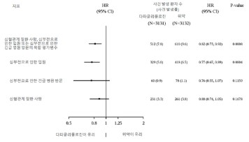 각 구성요소 별 최초 사건의 수는 실제로 발생한 구성요소별 사건 수를 나타내며, 복합 평가변수로의 사건 수는 가산되지 않는다. 위험비 추정치는 두 군 모두를 통합하여 총 15건 미만인 하위군에 대해 제시되어 있지 않다.