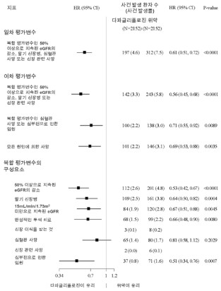 일차 복합 평가변수의 4가지 구성요소 모두 이러한 치료 효과에 개별적으로 기여하였다(그림 7). 다파글리플로진은 복합 평가변수인 50% 이상으로 지속된 eGFR의 감소, ESKD 또는 신장 관련 사망(HR 0.56[95% CI 0.45, 0.68], p<0.0001), 복합 평가변수인 CV 사망 및 심부전으로 인한 입원(HR 0.71[95% CI 0.55, 0.92], p=0.0089), 그리고 모든 원인에 의한 사망(HR 0.69[95% CI 0.53, 0.88], p=0.0035)의 발생률도 낮추었다.