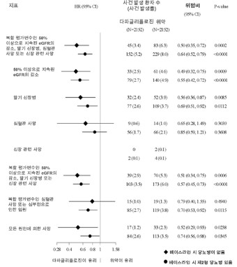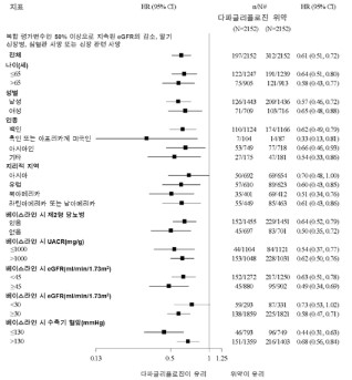 다파글리플로진의 치료 효과는 제2형 당뇨병이 있는 만성 신장병 환자 및 당뇨병이 없는 만성 신장병 환자에서 일관되었다(그림 8).