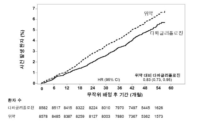 다파글리플로진의 위약 대비 치료 유익성은 베이스라인에서의 심혈관계 질환의 유무 및 기저 심부전의 유무와 관계없이 관찰되었고, 연령, 성별, 신기능 (eGFR) 및 지역 등 핵심 하위군 전반에서 일관성을 보였다.