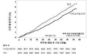 다파글리플로진 10mg은 일차 복합 평가변수인 심부전으로 인한 입원 또는 심혈관계 질환 사망의 예방에 대해 위약 대비 우월한 효과를 나타냈다 (그림 1).