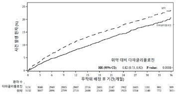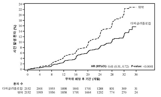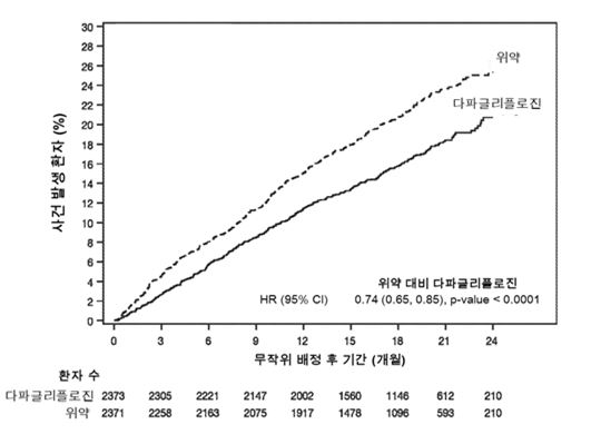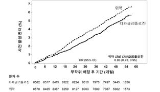 사건 발생 곡선은 다파글리플로진과 위약에 대해 초기부터 간격이 벌어져 시험 기간 전체동안 계속 지속되었다 (그림 2).