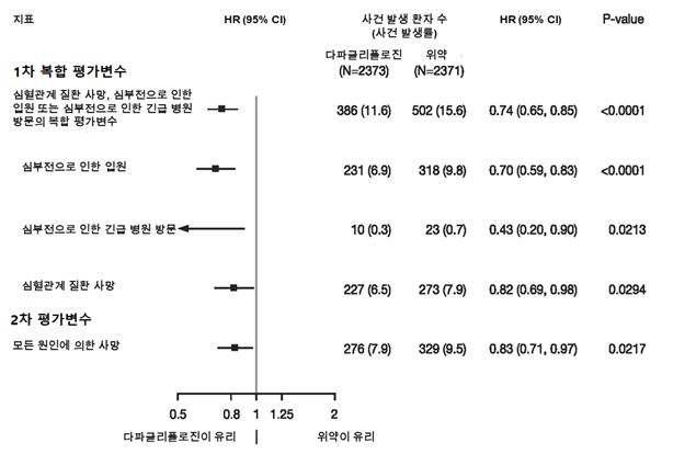 다파글리플로진은 일차 복합 평가변수인 심혈관계 질환 사망, 심부전으로 인한 입원 또는 심부전으로 인한 긴급 병원 방문의 발생률을 감소시켰다 (HR 0.74 [95% CI 0.65, 0.85], p < 0.0001).