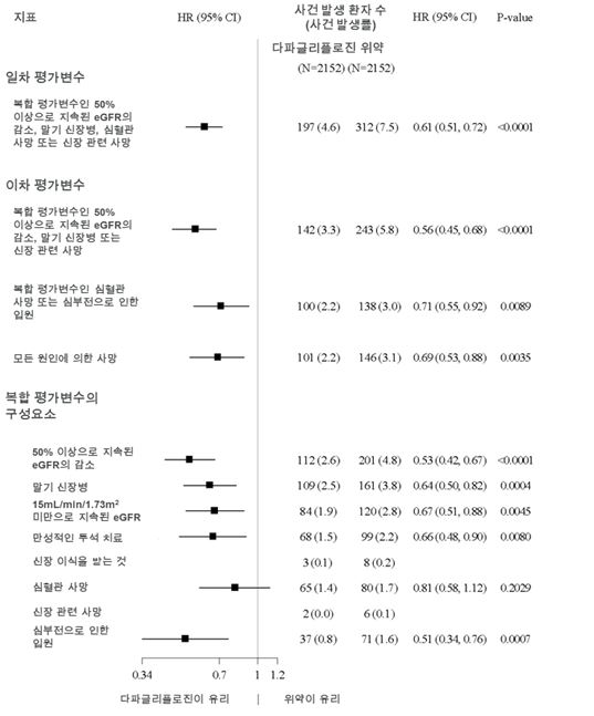 일차 복합 평가변수의 4가지 구성요소 모두 이러한 치료 효과에 개별적으로 기여하였다(그림 7). 다파글리플로진은 복합 평가변수인 50% 이상으로 지속된 eGFR의 감소, ESKD 또는 신장 관련 사망(HR 0.56[95% CI 0.45, 0.68], p<0.0001), 복합 평가변수인 CV 사망 및 심부전으로 인한 입원(HR 0.71[95% CI 0.55, 0.92], p=0.0089), 그리고 모든 원인에 의한 사망(HR 0.69[95% CI 0.53, 0.88], p=0.0035)의 발생률도 낮추었다.