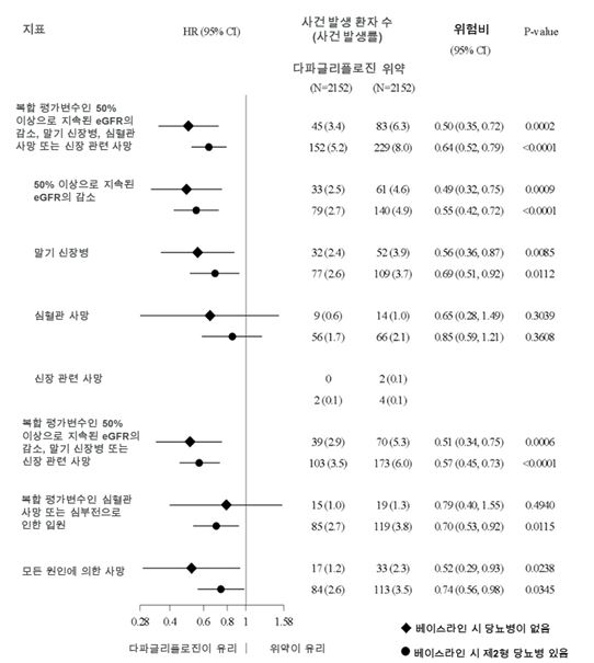 다파글리플로진의 치료 효과는 제2형 당뇨병이 있는 만성 신장병 환자 및 당뇨병이 없는 만성 신장병 환자에서 일관되었다(그림 8).