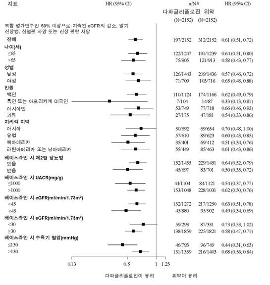 또한 심부전 병용 치료법, 신장 기능 (eGFR), 연령, 성별 및 지역 등 주요 하위군에 걸쳐 일차 평가변수에 대한 위약 대비 다파글리플로진의 치료 유익성이 일관되게 나타났다.
