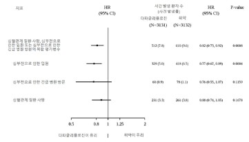각 구성요소에 대한 p‑value는 명목상의 값이다. 일차 평가변수의 구성요소로 나타나있는 심혈관계 질환 사망은 정식 제 1종 오류 통제 아래 이차 평가변수로 시험되었다.