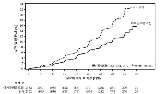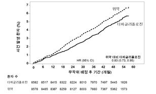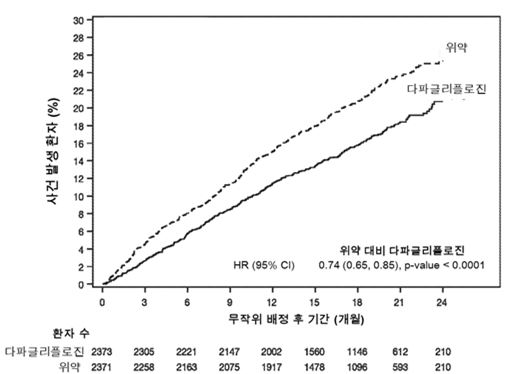 사건 발생 곡선은 다파글리플로진과 위약에 대해 초기부터 간격이 벌어져 시험 기간 전체동안 계속 지속되었다 (그림 2).