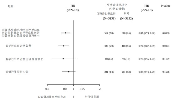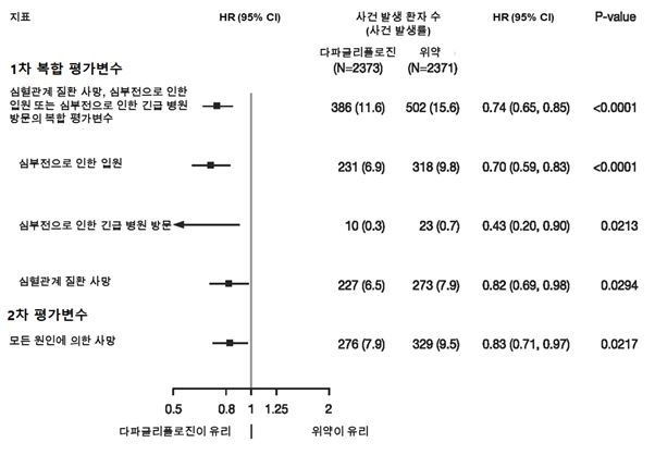다파글리플로진은 일차 복합 평가변수인 심혈관계 질환 사망, 심부전으로 인한 입원 또는 심부전으로 인한 긴급 병원 방문의 발생률을 감소시켰다 (HR 0.74 [95% CI 0.65, 0.85], p & 0.0001).