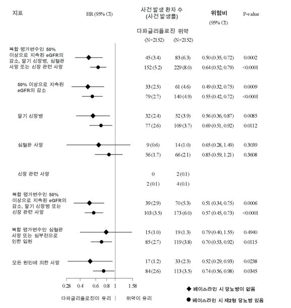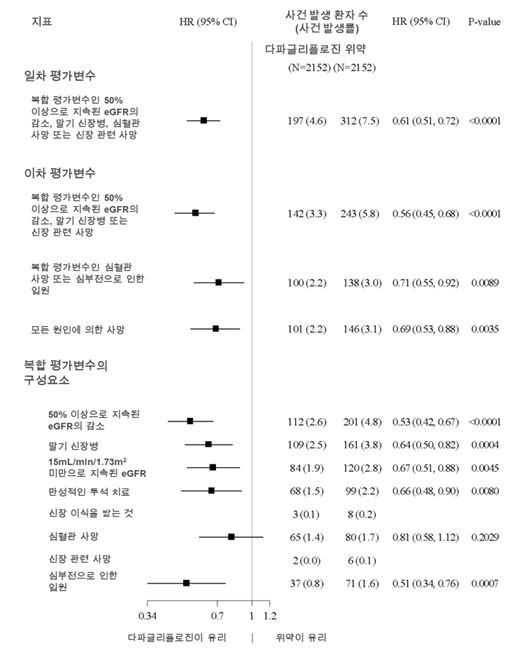 일차 복합 평가변수의 4가지 구성요소 모두 이러한 치료 효과에 개별적으로 기여하였다(그림 7). 이 약은 복합 평가변수인 50% 이상으로 지속된 eGFR의 감소, ESKD 또는 신장 관련 사망(HR 0.56[95% CI 0.45, 0.68], p&0.0001), 복합 평가변수인 CV 사망 및 심부전으로 인한 입원(HR 0.71[95% CI 0.55, 0.92], p=0.0089), 그리고 모든 원인에 의한 사망(HR 0.69[95% CI 0.53, 0.88], p=0.0035)의 발생률도 낮추었다.