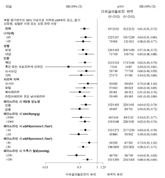 또한 심부전 병용 치료법, 신장 기능 (eGFR), 연령, 성별 및 지역 등 주요 하위군에 걸쳐 일차 평가변수에 대한 위약 대비 다파글리플로진의 치료 유익성이 일관되게 나타났다.