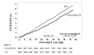 다파글리플로진 10mg은 일차 복합 평가변수인 심부전으로 인한 입원 또는 심혈관계 질환 사망의 예방에 대해 위약 대비 우월한 효과를 나타냈다 (그림 1).