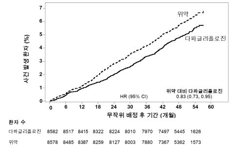 다파글리플로진의 위약 대비 치료 유익성은 베이스라인에서의 심혈관계 질환의 유무 및 기저 심부전의 유무와 관계없이 관찰되었고, 연령, 성별, 신기능 (eGFR) 및 지역 등 핵심 하위군 전반에서 일관성을 보였다.