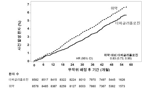 혈당이 충분히 조절되지 않는 제2형 당뇨병 환자 중 심혈관계 질환이 확인되었거나 심혈관계 위험인자가 있는 환자에서 심혈관계 사건 발생에 대한 다파글리플로진의 영향은 ‘사용상의 주의사항 13. 전문가를 위한 정보, 2) 임상시험 정보’ 항을 참고한다.