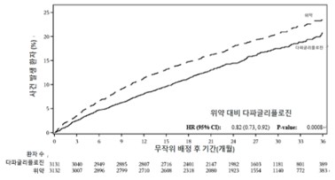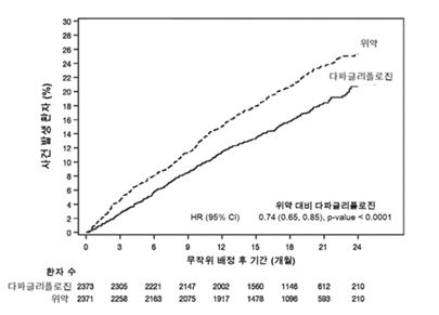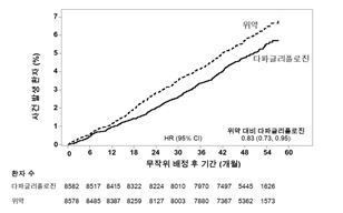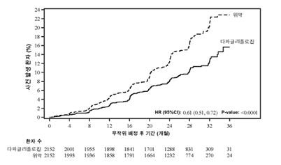 사건 발생 곡선은 다파글리플로진과 위약에 대해 초기부터 간격이 벌어져 시험 기간 전체동안 계속 지속되었다 (그림 2).