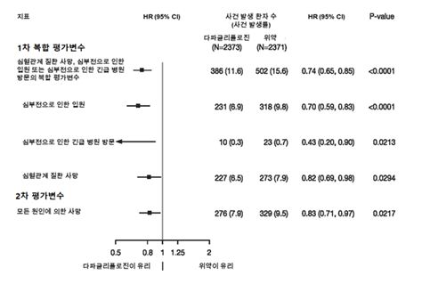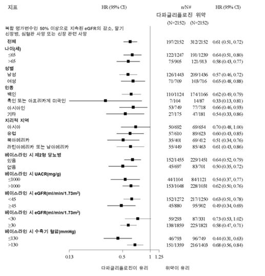 또한 심부전 병용 치료법, 신장 기능 (eGFR), 연령, 성별 및 지역 등 주요 하위군에 걸쳐 일차 평가변수에 대한 위약 대비 다파글리플로진의 치료 유익성이 일관되게 나타났다.
