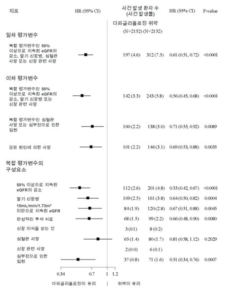 일차 복합 평가변수의 4가지 구성요소 모두 이러한 치료 효과에 개별적으로 기여하였다(그림 7). 이 약은 복합 평가변수인 50% 이상으로 지속된 eGFR의 감소, ESKD 또는 신장 관련 사망(HR 0.56[95% CI 0.45, 0.68], p<0.0001), 복합 평가변수인 CV 사망 및 심부전으로 인한 입원(HR 0.71[95% CI 0.55, 0.92], p=0.0089), 그리고 모든 원인에 의한 사망(HR 0.69[95% CI 0.53, 0.88], p=0.0035)의 발생률도 낮추었다.