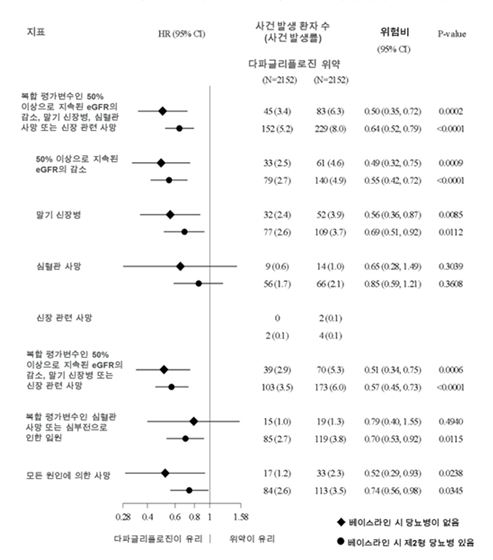 이 약의 치료 효과는 제2형 당뇨병이 있는 만성 신장병 환자 및 당뇨병이 없는 만성 신장병 환자에서 일관되었다(그림 8).