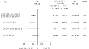 각 구성요소 별 최초 사건의 수는 실제로 발생한 구성요소별 사건 수를 나타내며, 복합 평가변수로의 사건 수는 가산되지 않는다. 위험비 추정치는 두 군 모두를 통합하여 총 15건 미만인 하위군에 대해 제시되어 있지 않다.