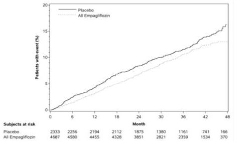 또한 현성알부민뇨가 있는 환자에서 지속적인 정상알부민뇨 또는 미세알부민뇨로의 전환은 위약대비 엠파글리플로진에서 더 높게 나타났다. (엠파글리플로진 49.7%, 위약 28.8%, 위험비(HR) 1.82, 95 % CI 1.40, 2.37).